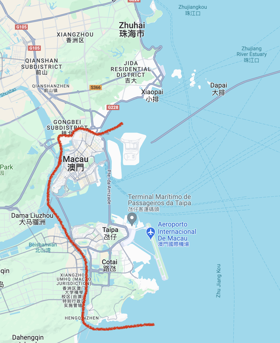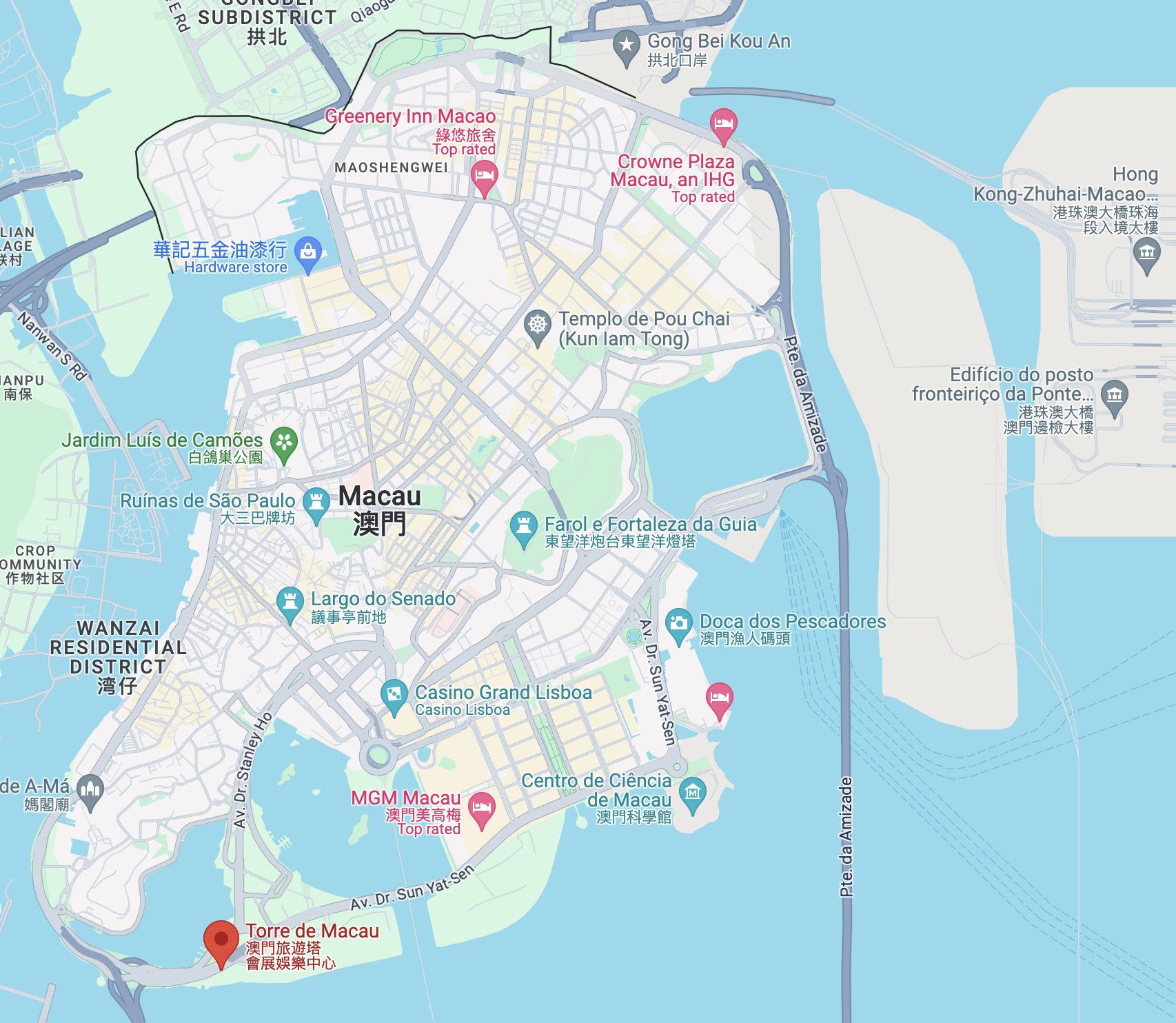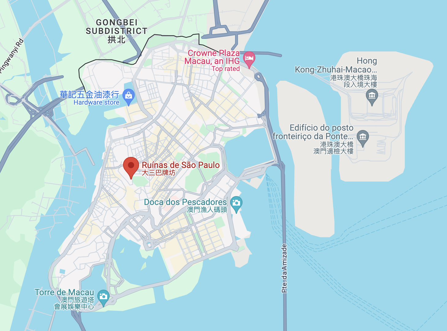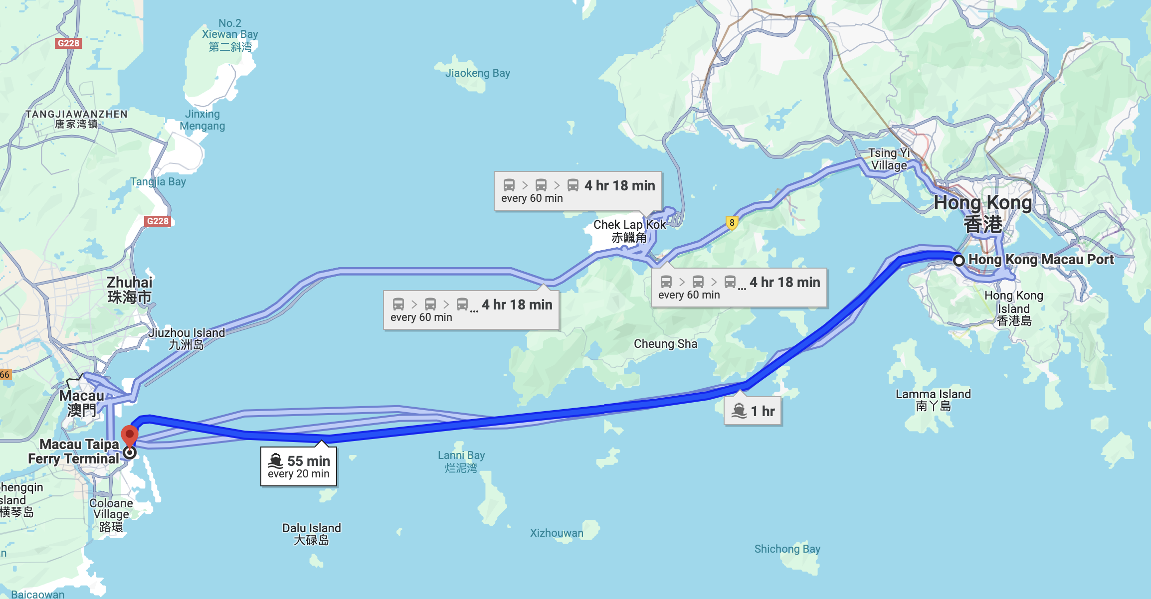 As fascinating as it is to explore what a Chinese city looks like if it were ruled by the British for 150 years, if you're at all curious about what it would look like if a Chinese city were ruled by the Portugeuse for nearly 450 years (!), well that's just next door! As you can see from the map below, it's just a 1hr ferry to Macau from HK, and it only costs about US$20. There's also a recently completed bridge connecting HK and Macau. I believe the driving time is really only 2 hours, but the bus will take longer both because buses always take longer and from what I read online there's some complexity as one goes through the immigration area and gets back to the bus.