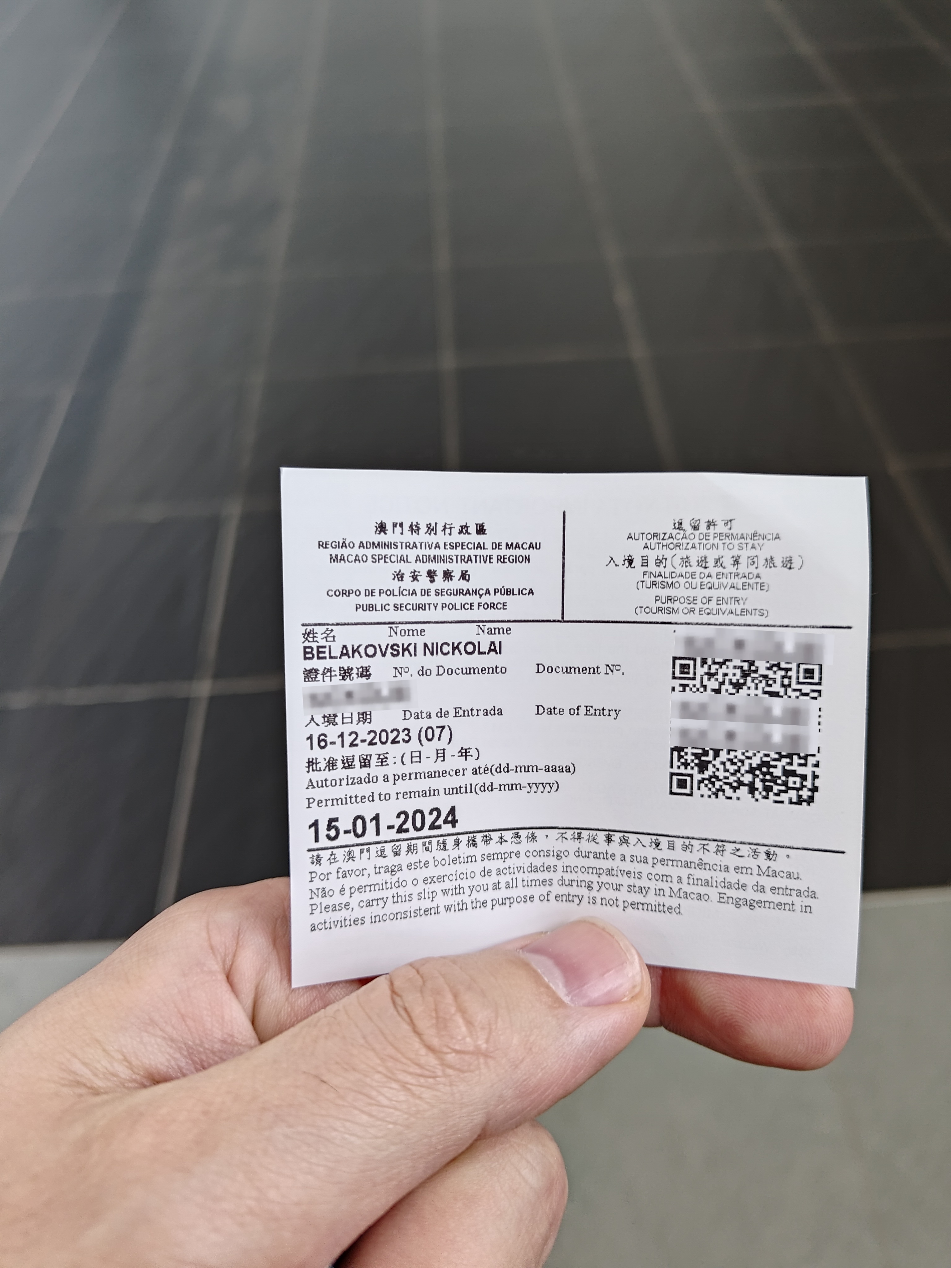 When you get to Macau, you get a paper visa similar to the one you get in HK. As you can see it's in English, Portugeuse, and Chinese all at the same time.